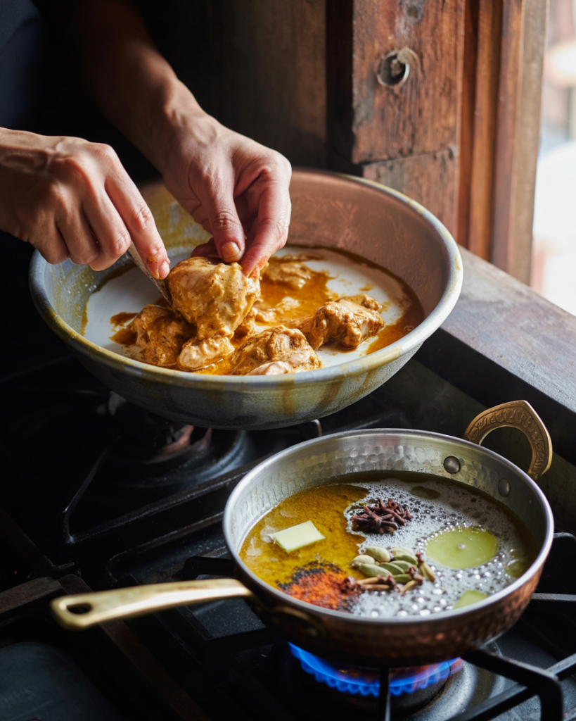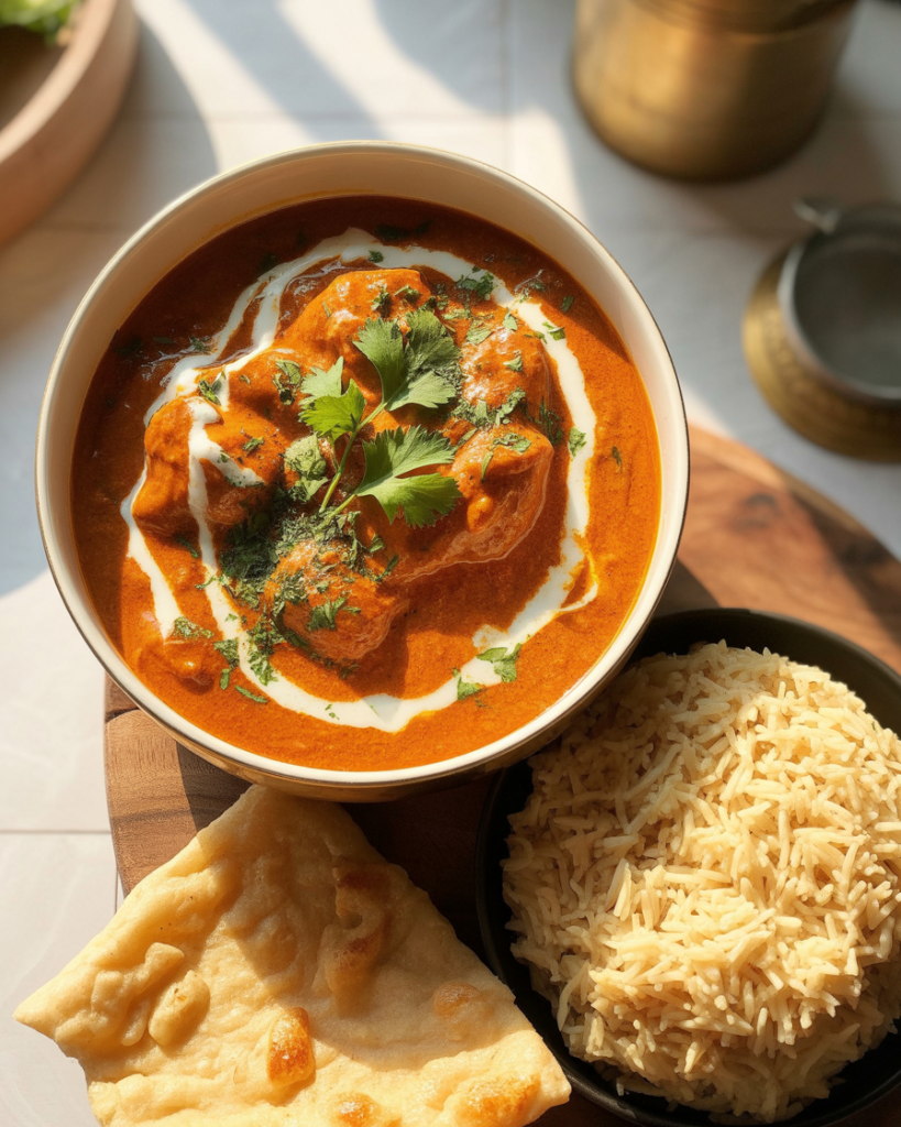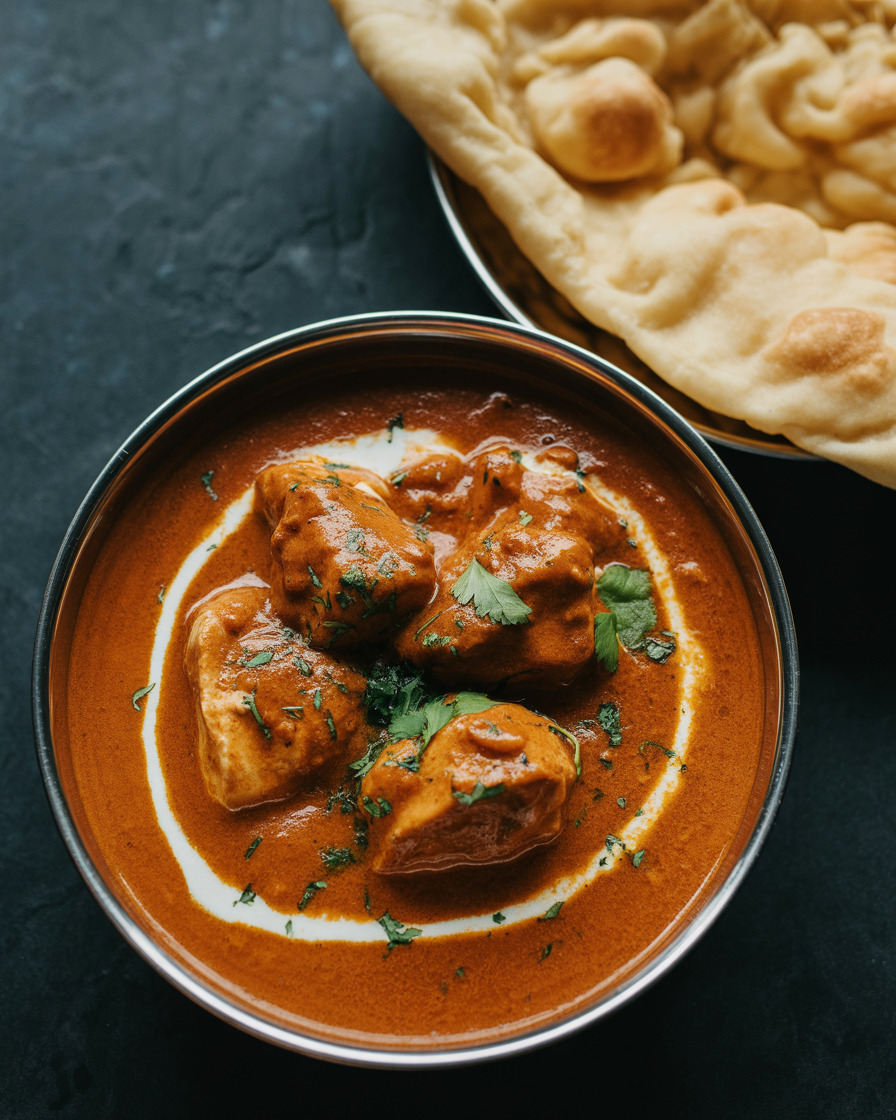 Tender marinated chicken simmered in a luscious tomato-butter-cream sauce with fragrant Indian spices. Perfect for a comforting dinner served with naan or rice.