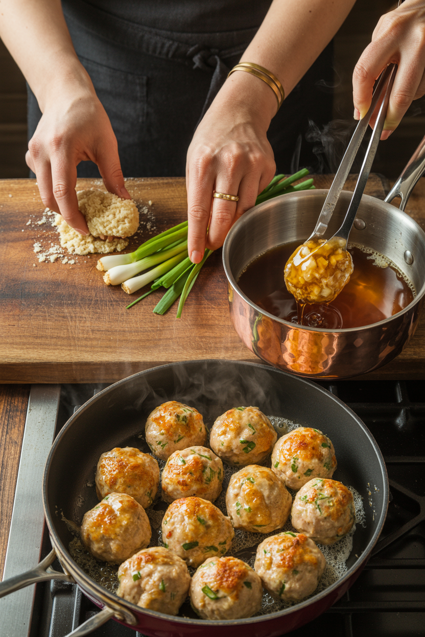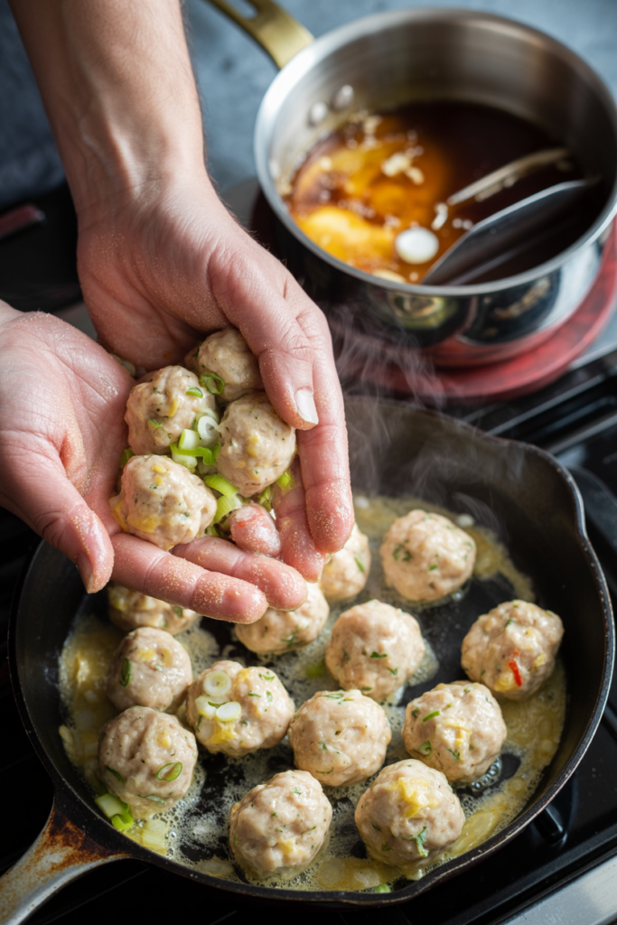- 2. Mix the Meatballs: In a large bowl, combine ground chicken, breadcrumbs, egg, garlic, green onions, soy sauce, sesame oil, salt, and pepper. Mix until just combined—don’t overwork the meat.