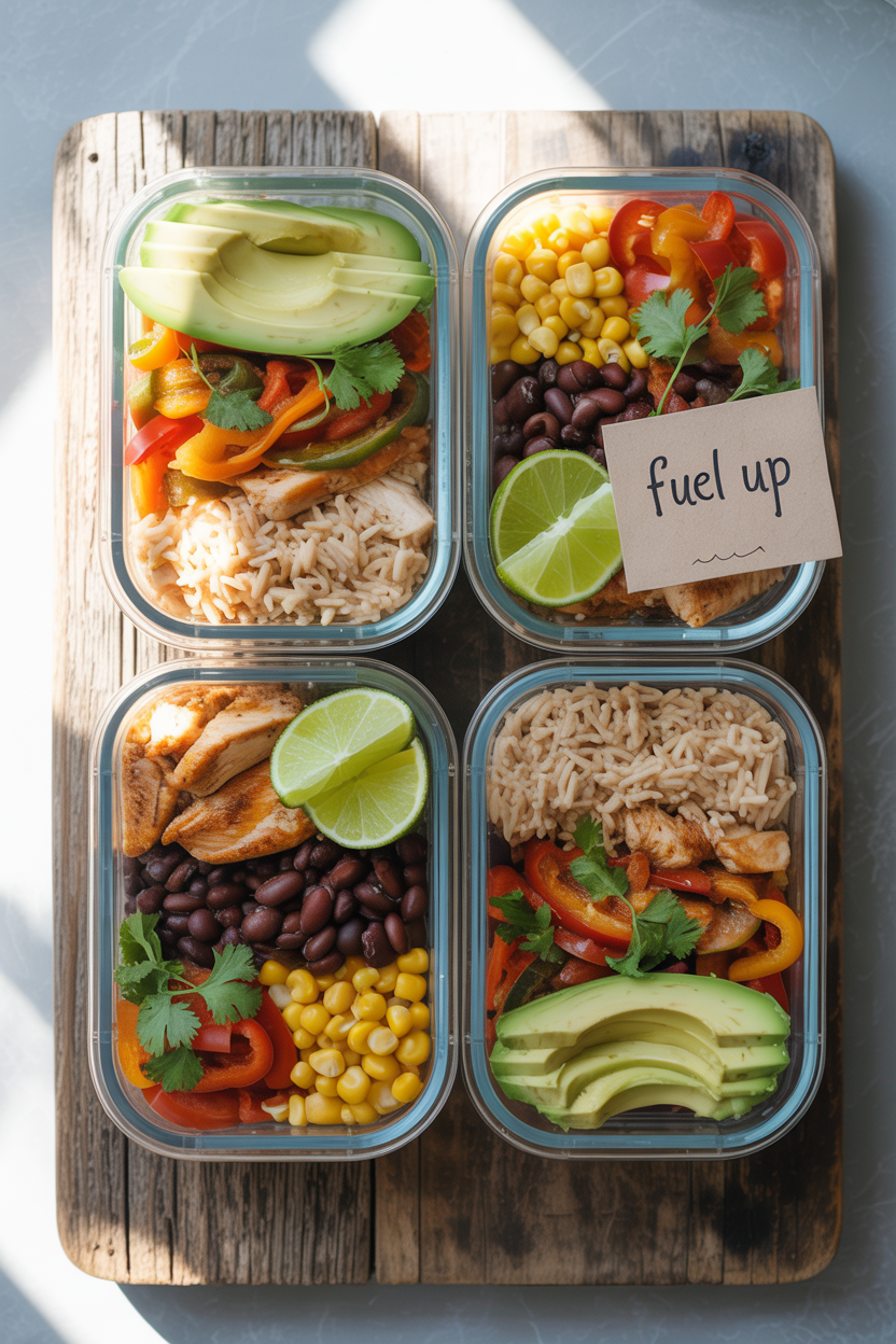 - 5. Assemble the Bowls: Divide cooked rice into 4 meal prep containers. Top with chicken, sautéed bell peppers, black beans, corn, avocado, shredded cheese (if using), and garnish with cilantro and lime wedges.