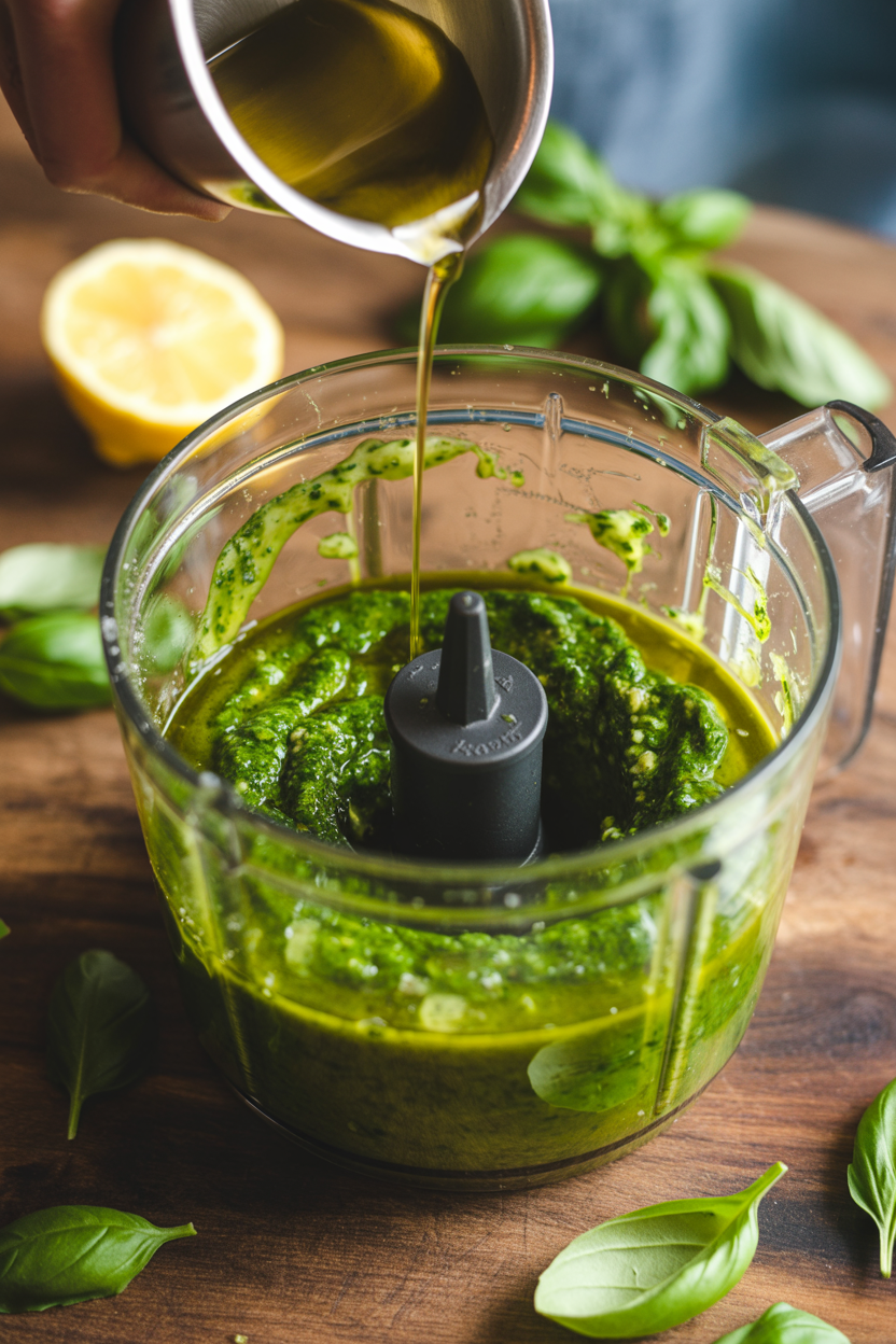 - 2. Make the Pesto: While pasta cooks, add basil, pine nuts, garlic, and Parmesan to a food processor or blender. Pulse until finely chopped. With the motor running, slowly drizzle in olive oil until smooth and creamy. Season with salt, pepper, and optional lemon juice.