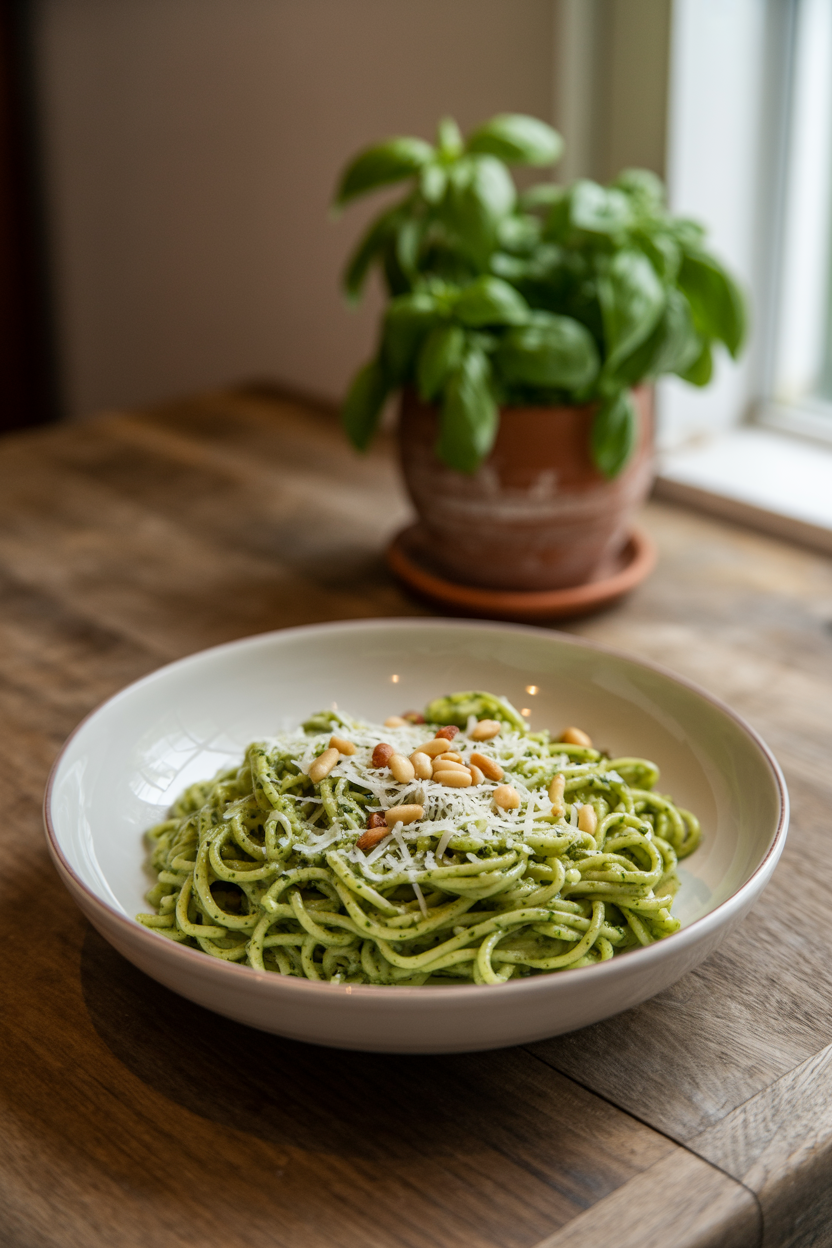 A vibrant and creamy basil pesto sauce tossed with hot pasta and topped with extra Parmesan cheese. It's quick, customizable, and irresistibly delicious!