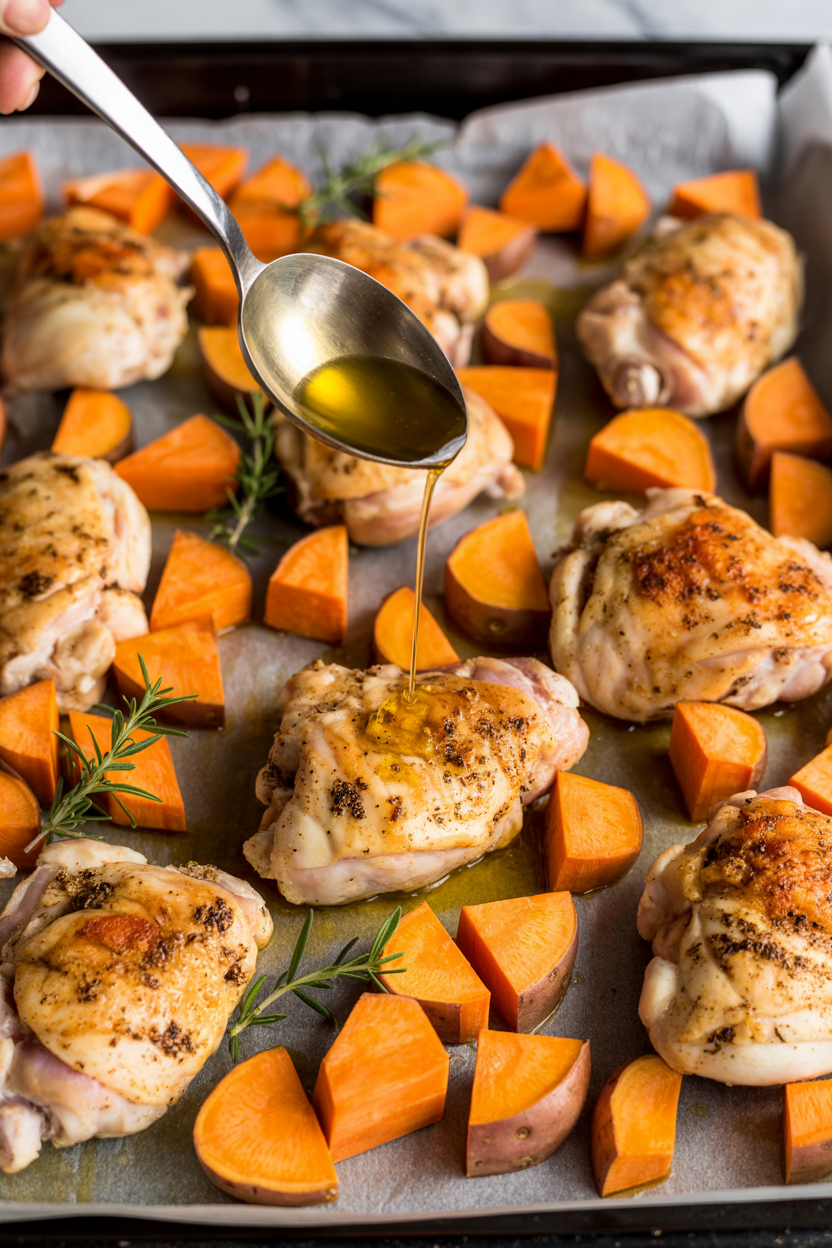 - 4. Roast: Roast for 35–40 minutes, or until the chicken is golden and reaches an internal temperature of 165°F (74°C) and the sweet potatoes are fork-tender.