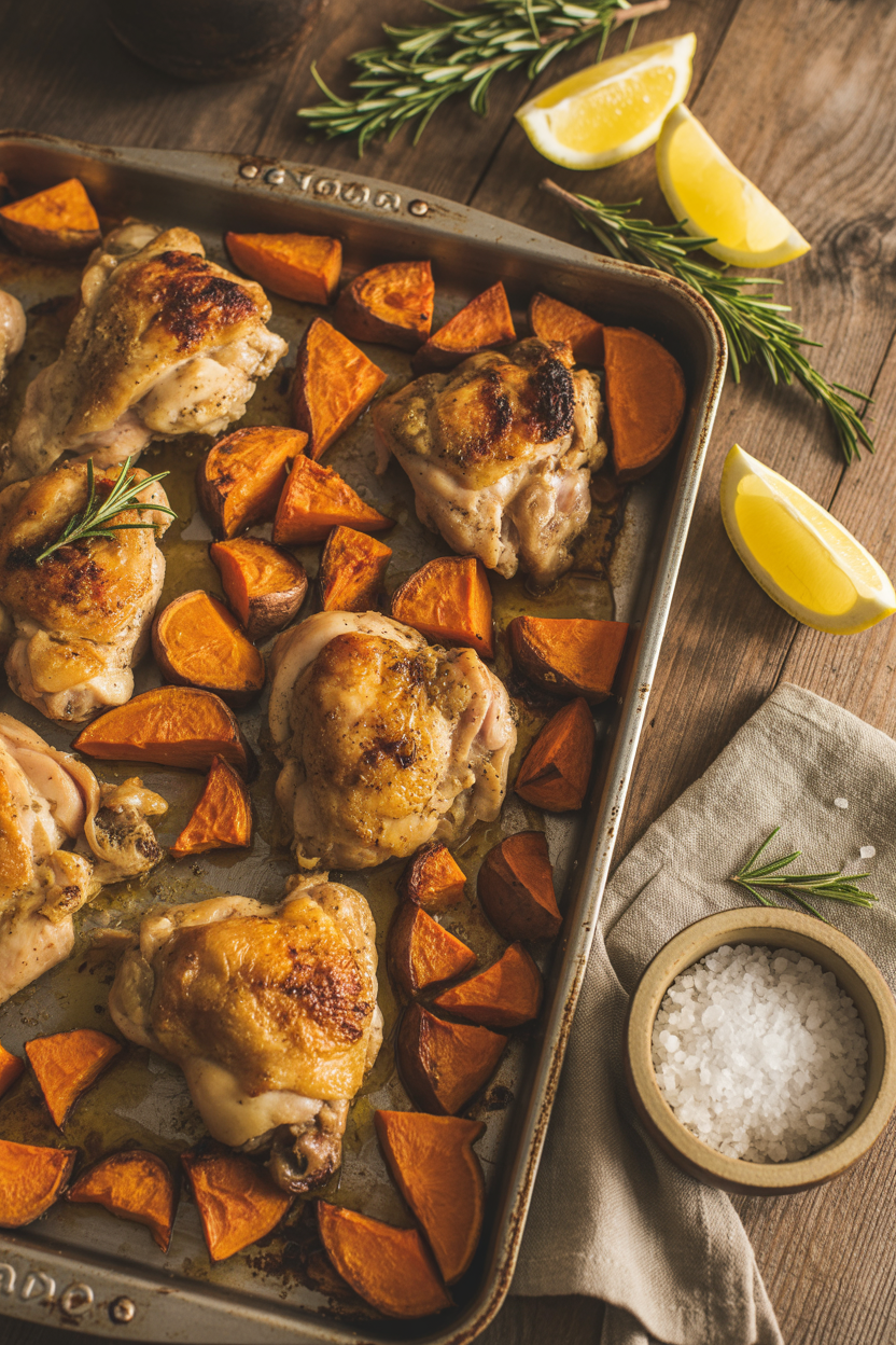 A comforting and nutritious one-pan chicken dinner featuring roasted sweet potatoes, red onions, and tender, golden chicken seasoned with paprika, garlic, and thyme. Minimal cleanup and big flavor!